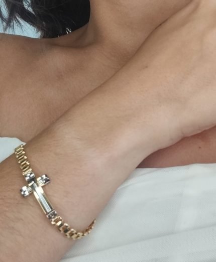 Brazalete (21 cm) Tejido Reloj c/ Cruz Pasante – Oro Dos Tonos 18Kts