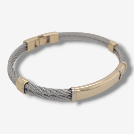 Pulsera (20 cm) Bangle c/ Placa & Broche de Oro & Cinco Guayas de Acero – Oro Amarillo 14Kts