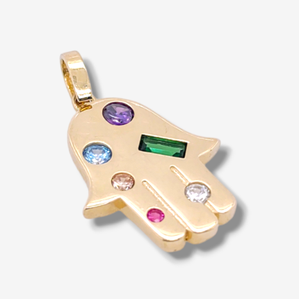 Dije (14 x 16 mm) Mano Hamsa c/ Zircones de Colores – Oro Amarillo 14Kts