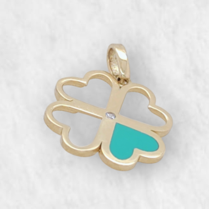 Dije (16 x 16 mm) Trebol Calado Corazones c/ Turquesa – Oro Amarillo 14Kts