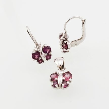 Set Zarcillos & Dije Mariposa con Granate – Oro Blanco 18Kts