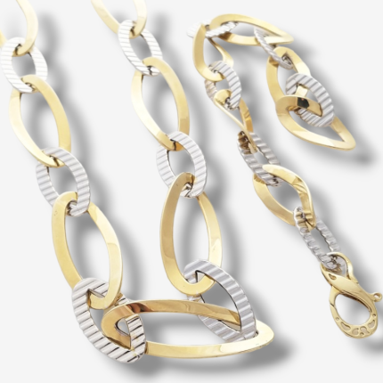 Set Pulsera/Collar Eslabones Planos – Oro Blanco & Amarillo 14Kts