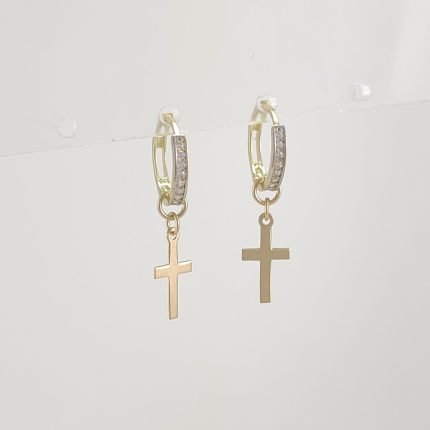 Huggies (12 mm) con Zircones y Cruz Plana – Oro Amarillo 14Kts