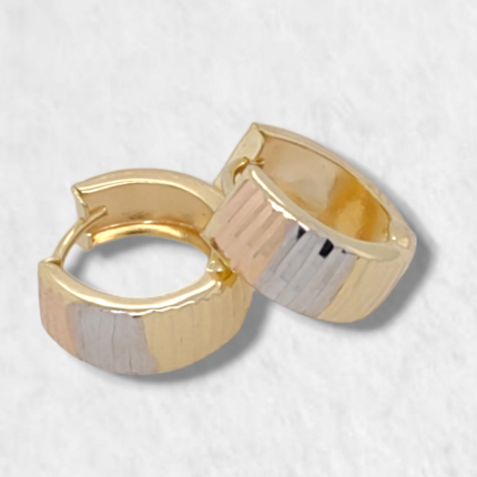 • Argollas (20 mm) Tres Lineas Media Cana Cruzadas - Oro Tres Tonos 14Kts Argollas (20 mm) Tres Lineas Media Cana Cruzadas - Oro Tres Tonos 14Kts $510.00