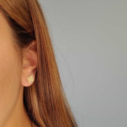 Zarcillos (11 x 11 mm) Post Treboles c/ Halo & Diamantes Pave (0.56 Ct) – Oro Amarillo 14Kts