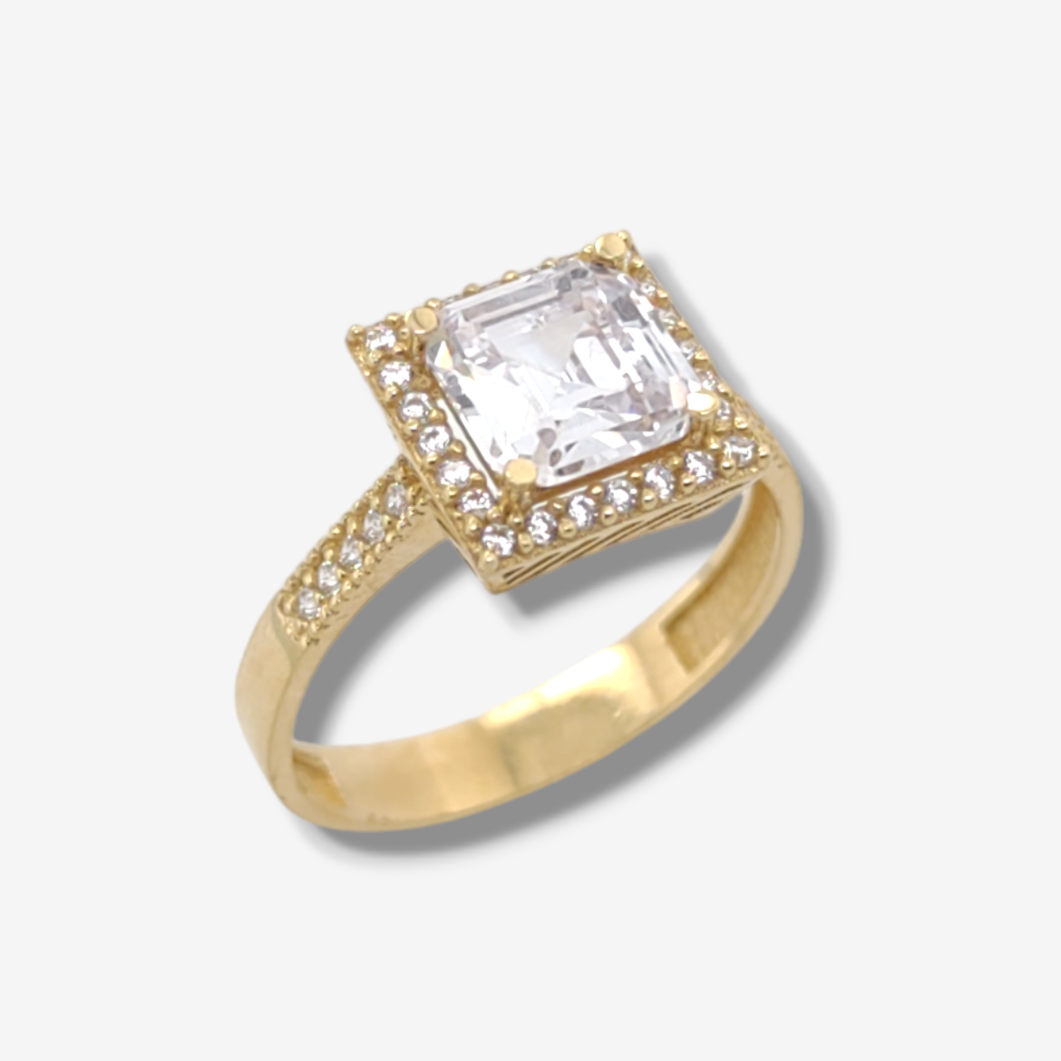 Anillo Compromiso Zircon Central c/ Halo de Zircones – Oro Amarillo 18Kts