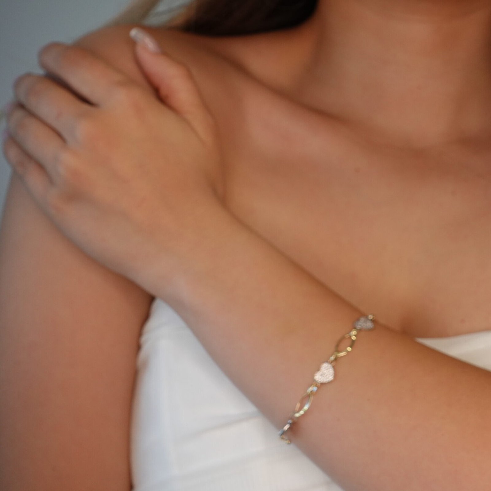 Brazalete (18 cm) Corazones c/ Zircones Pave – Oro Tres Tonos 14Kts