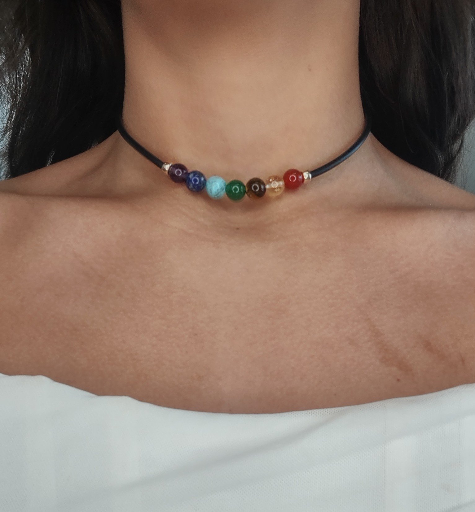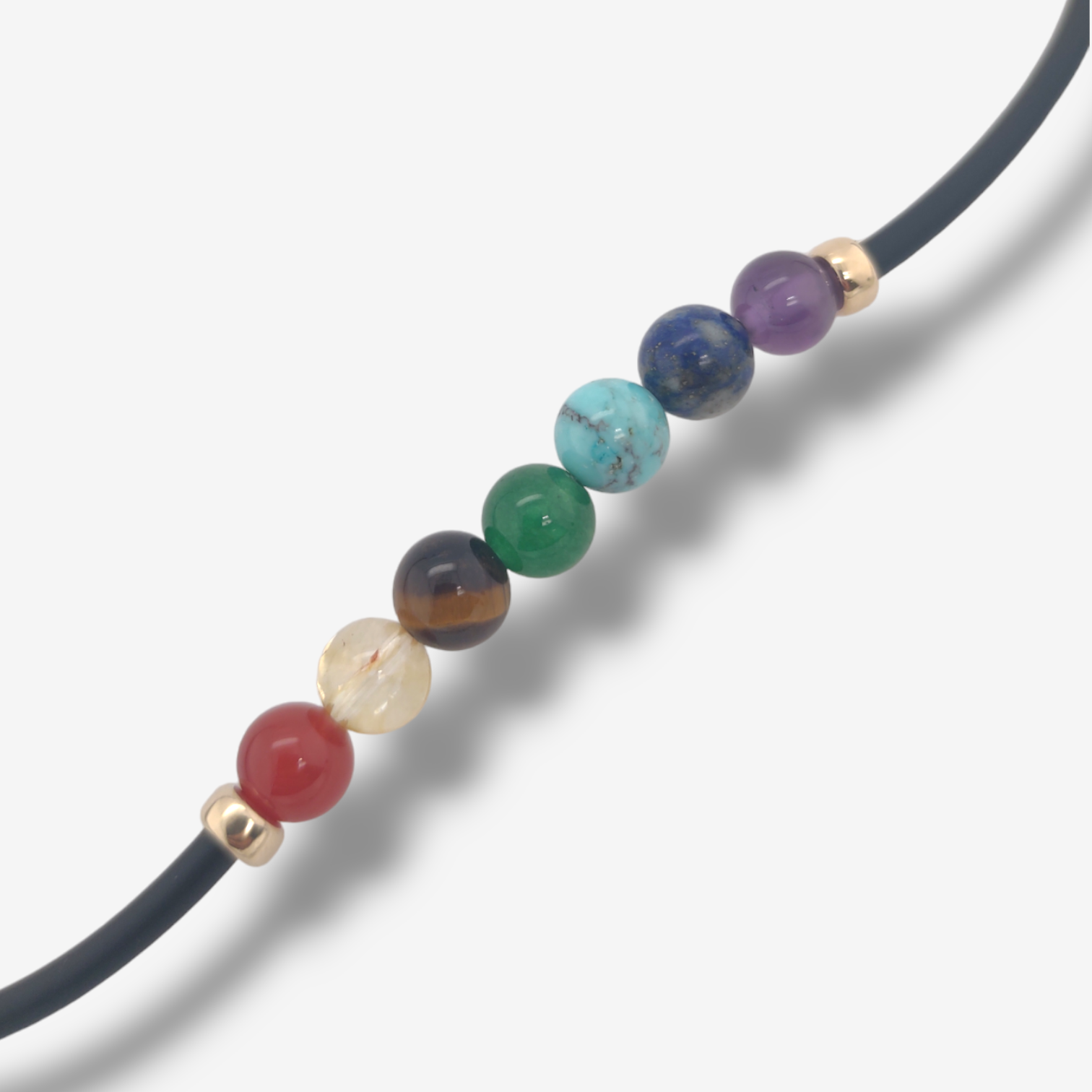 Collar (47 cm) Cordon Caucho c/ 7 Gemas Semipreciosas & Detalles en Oro – Oro Amarillo 14Kts