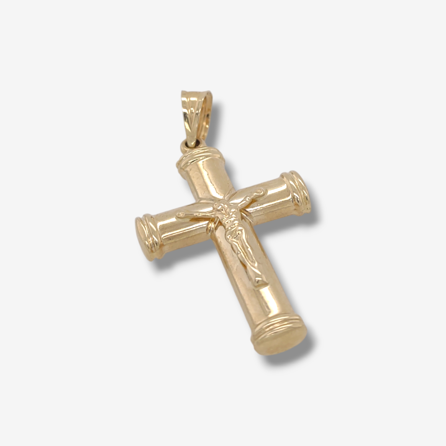 Crucifijo (22 x 31 mm) Tubo Media Cana Light & Terminales Doble Linea – Oro Amarillo 14Kts