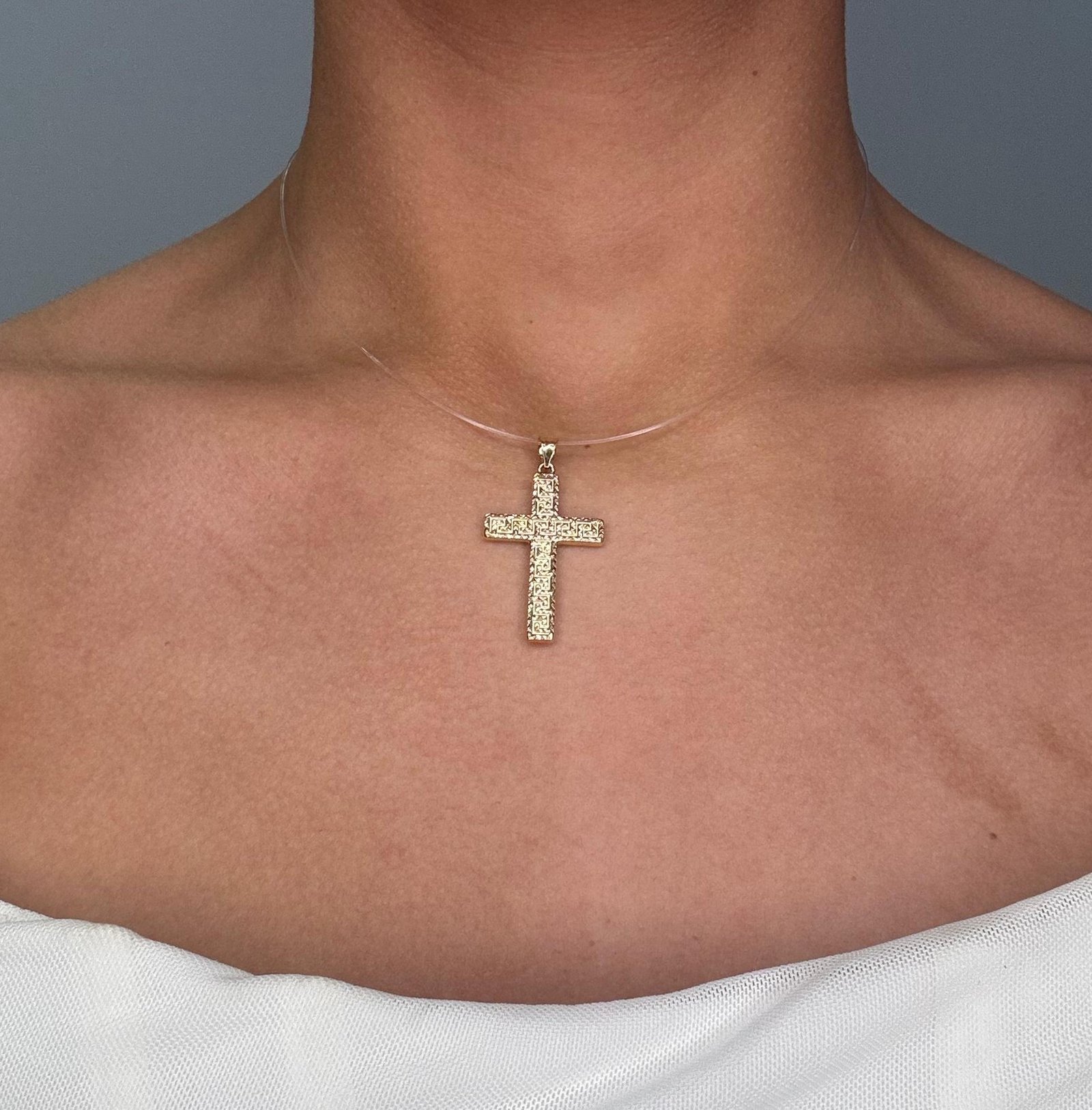 Cruz (20 x 33 mm) Light c/ Greca & Bordes Diamantados – Oro Amarillo 14Kts