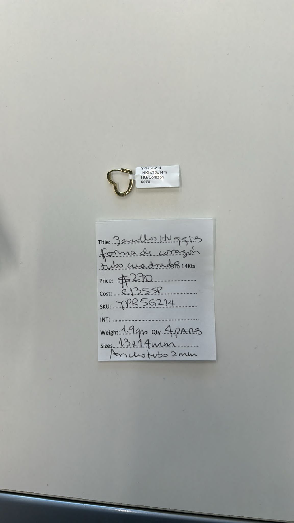 Huggies (13 x 14 mm) Forma de Corazon Tubo Cuadrado – Oro Amarillo 14Kts