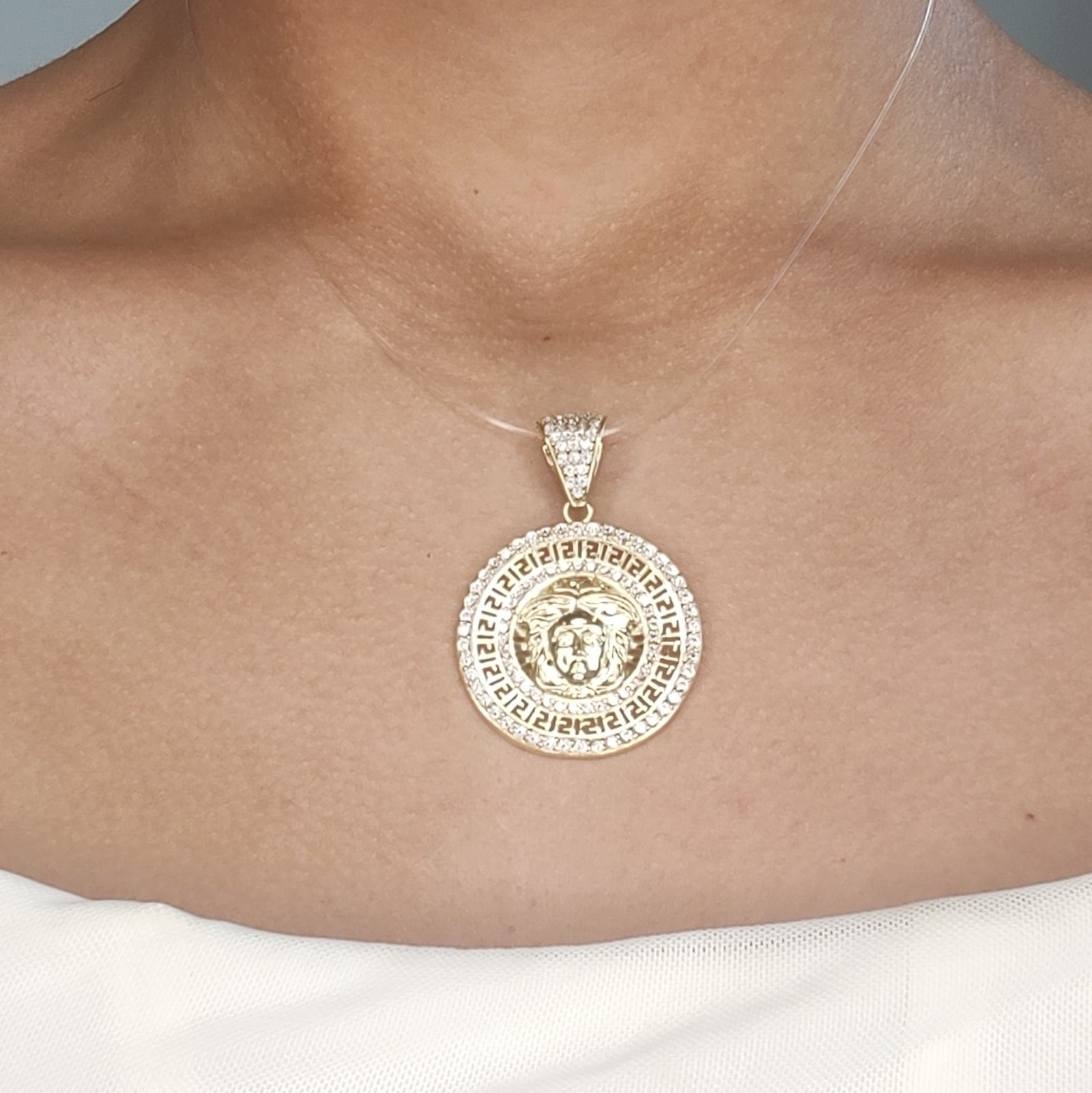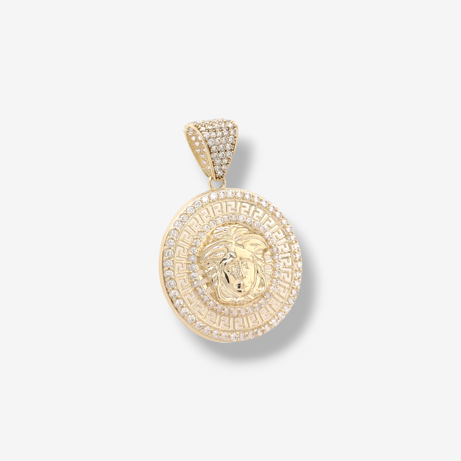 Medalla (31 mm) Medusa c/ Greca & doble Marco c/ Zircones Pave – Oro Amarillo 14Kts