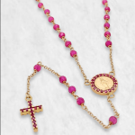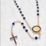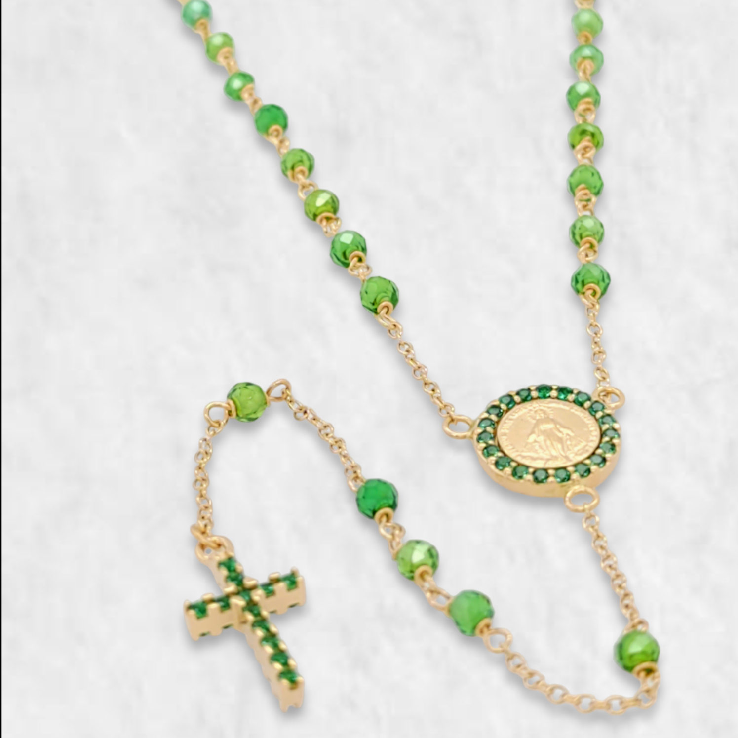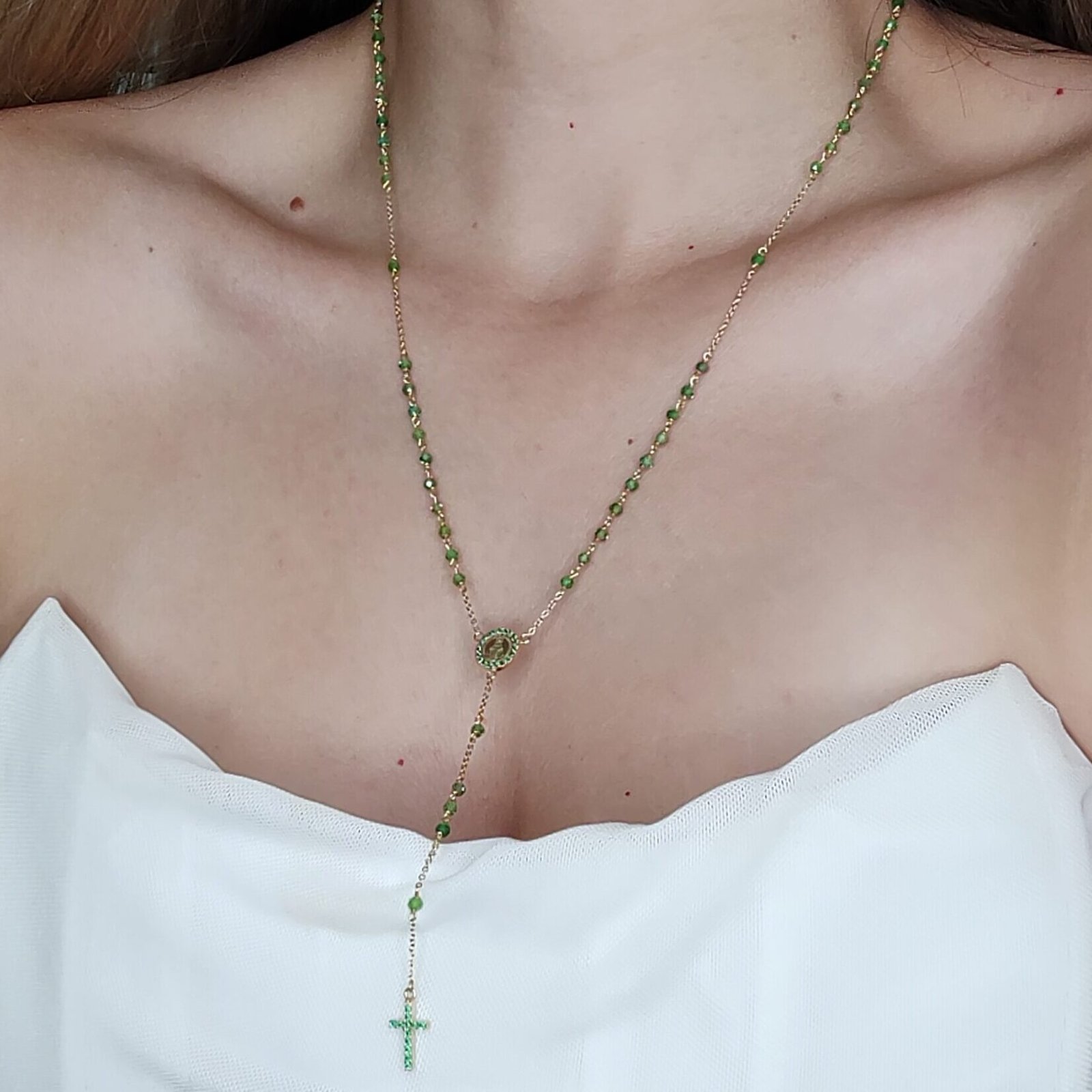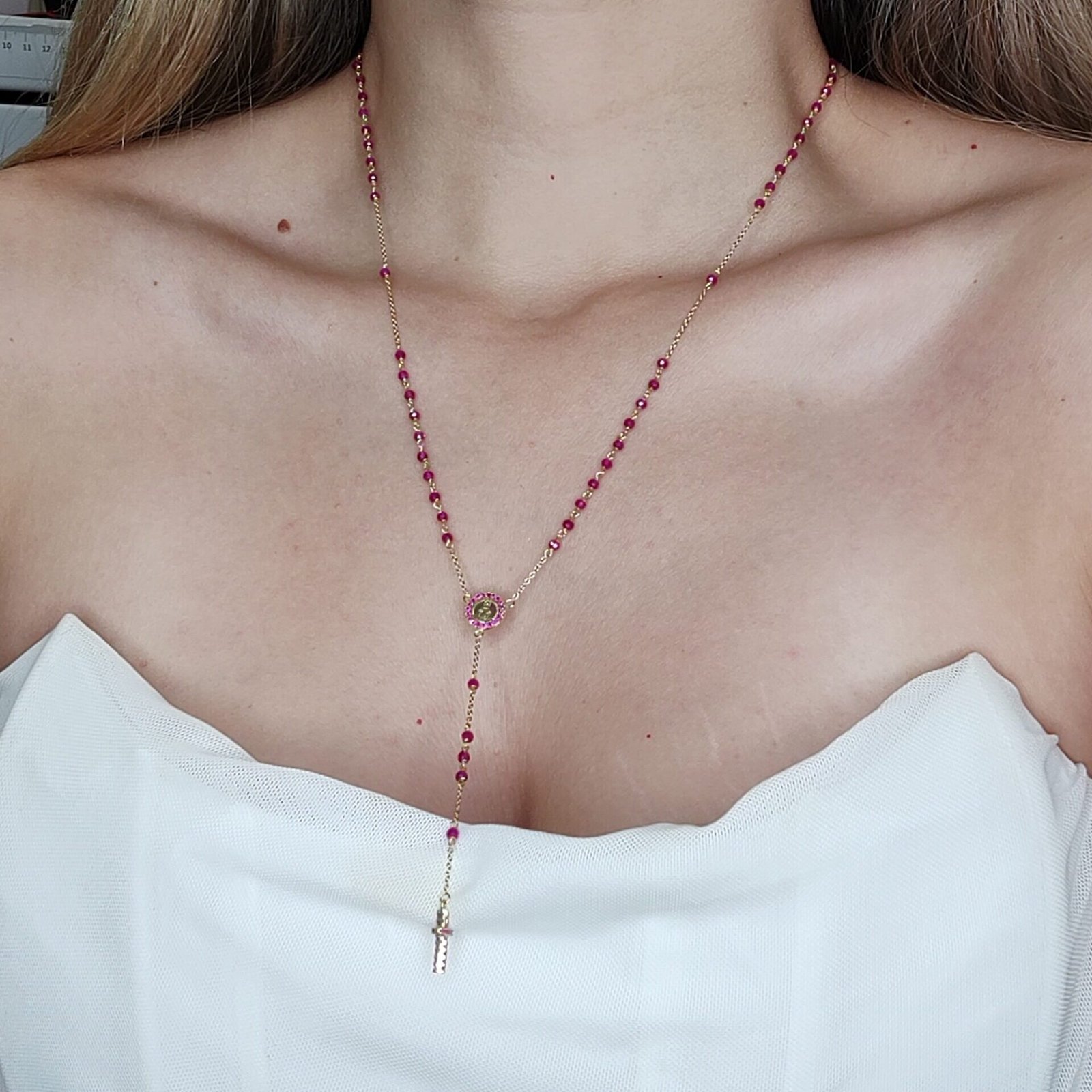 Dimensiones: Largo 50 + 8 cm; Piedra Preciosa 2.5 mm; Medalla 9 mm; Cruz 7 x 11 mm