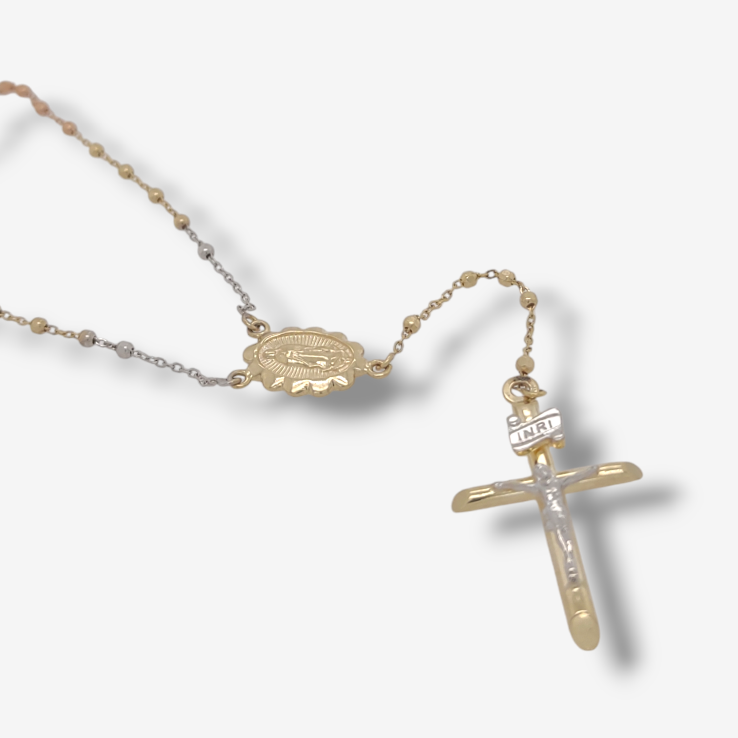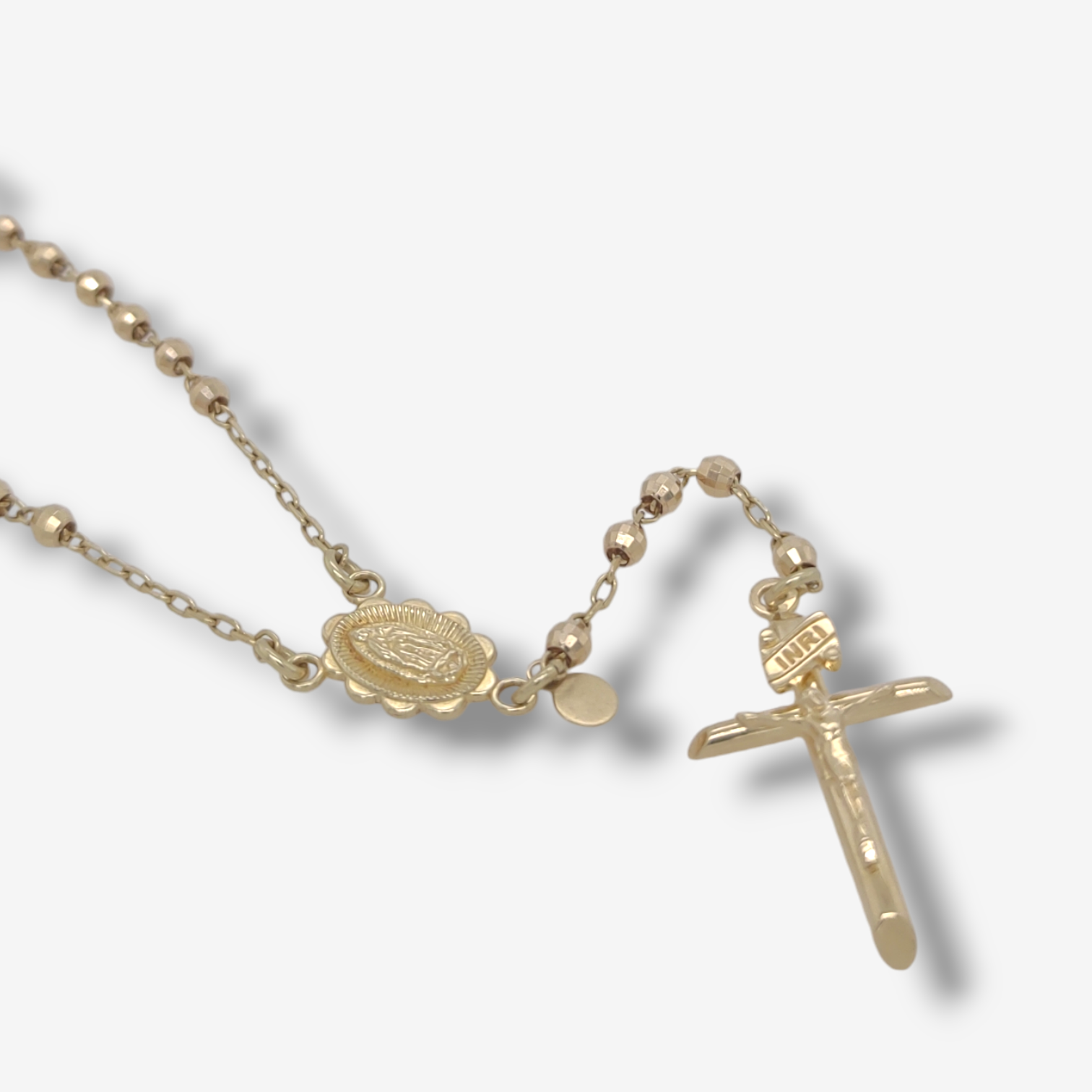 Rosario (50 cm) Esferas Facetadas (2.9 mm) Vitela Guadalupe c/ Crucifijo Mediano – Oro Amarillo 18Kts