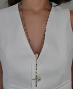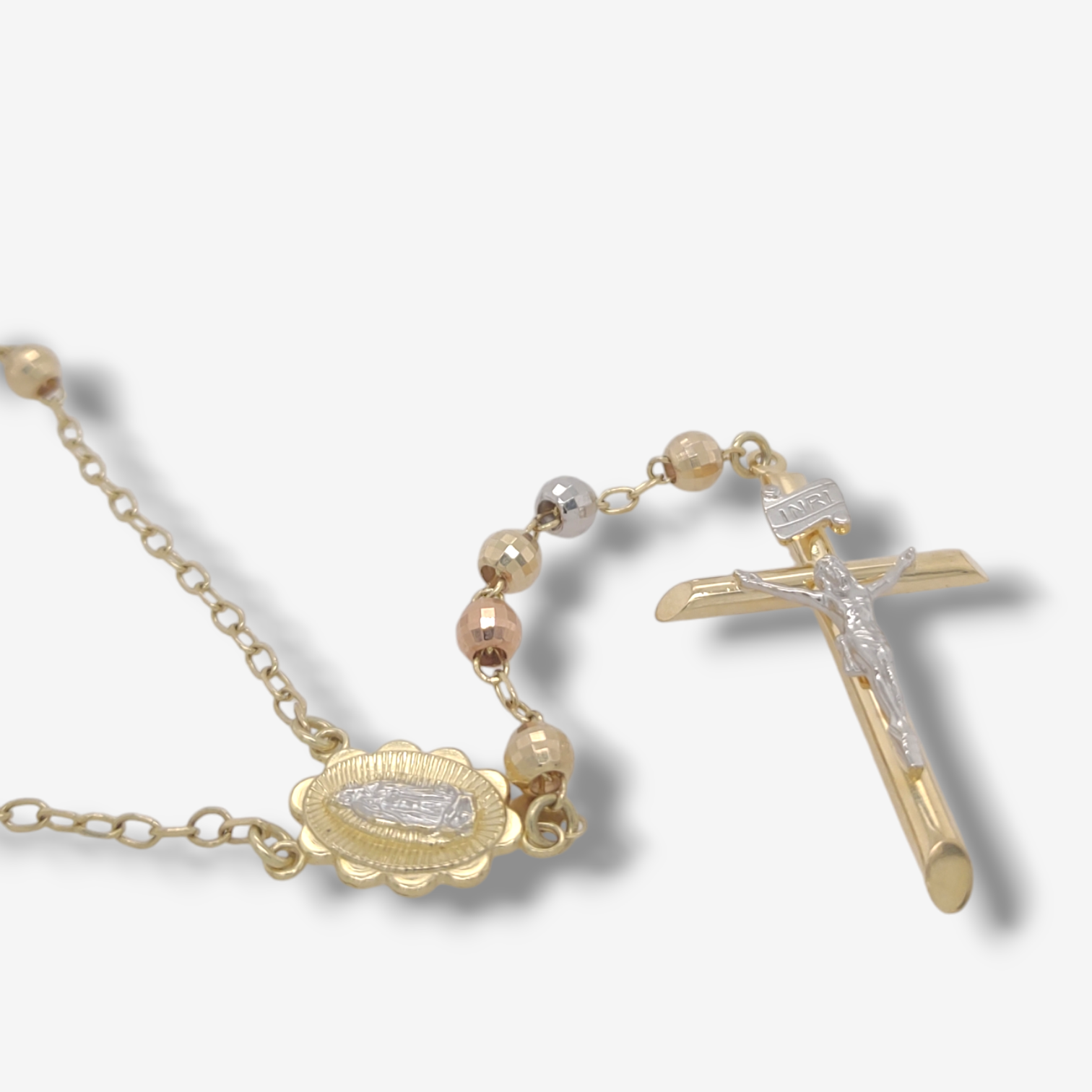 Rosario (65 cm) Esferas Facetadas (5 mm) Vitela Guadalupe & Crucifijo Grande – Oro Tres Tonos 18Kts