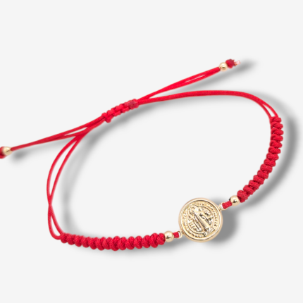 Brazalete Ajustable c/ Hilo Chino Rojo & San Benito Abad – Oro Amarillo 14Kts