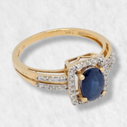 Anillo Compromiso c/ Zafiro Azul & Halo de Diamantes – Oro Amarillo 14Kts
