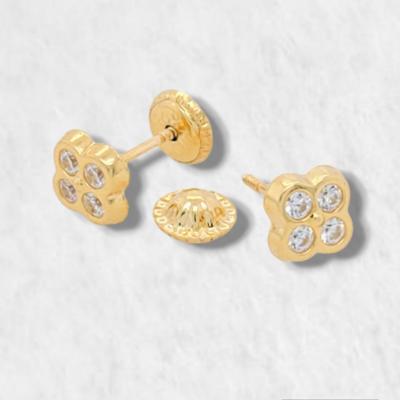 Zarcillos (6 x 6 mm) Treboles c/ 4 Zircones (Screwback/Abridores) – Oro Amarillo 18Kts